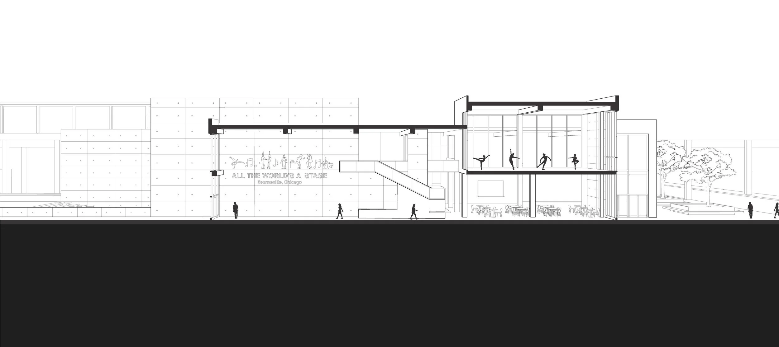 This project aimed at designing a creative learning facility that encourages interactions between the Illinois Tech community and the neighborhood. The neighborhood's musical history, which has unfortunately disappeared, inspired us to have our program focus on music and dance. The north building contains practice rooms and instrument rentals for those wanting to learn an instrument. The south building contains an auditorium and dance studio for those to watch a performance. This project was done in a group of two, so not all drawings are completed by me.